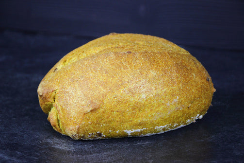 Ingredienti: farina di grano tenero integrale macinata a pietra*, lievito naturale da pasta madre* (farina di grano tenero tipo "0"*, acqua), noci, sale, malto d'orzo,curcuma*.