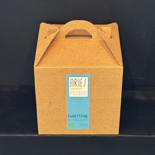Panettone artigianale classico, arricchito con gocce di cioccolato fondente, preparato con pasta madre per una lievitazione naturale lenta che dona una morbidezza unica.